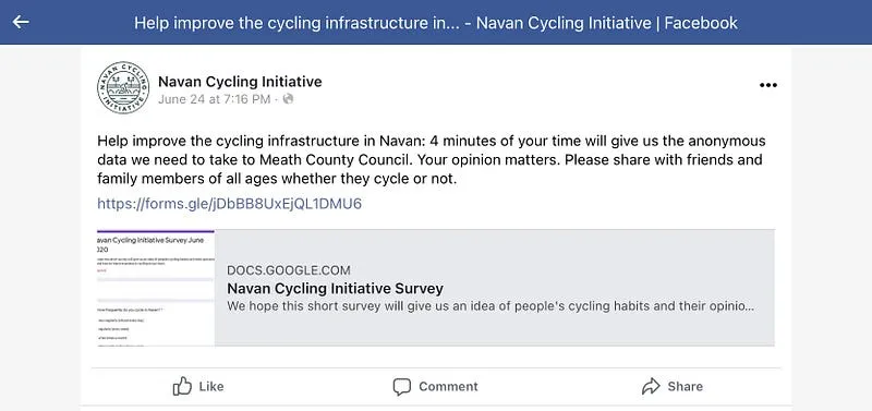 It just so happened I wasn’t the only person underwhelmed with cycling around Navan. So, after filling in the survey, I met up with these like minded folks and before you can say “any other business?” I found myself as esteemed Secretary of the Navan Cycling Initiative.